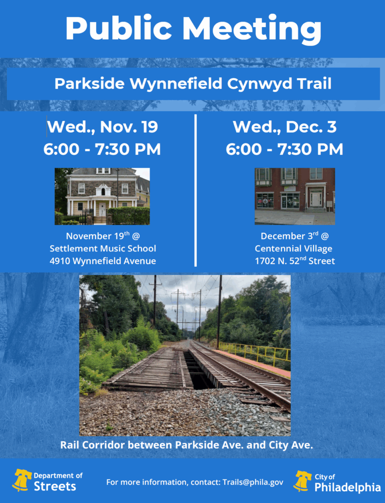 Events « All Events This event has passed. Public Meeting: Parkside Wynnefield Cynwyd Trail November 19, 2025 @ 6:00 pm – 7:30 pm Add to calendar Google Calendar iCalendar Outlook 365 Outlook Live